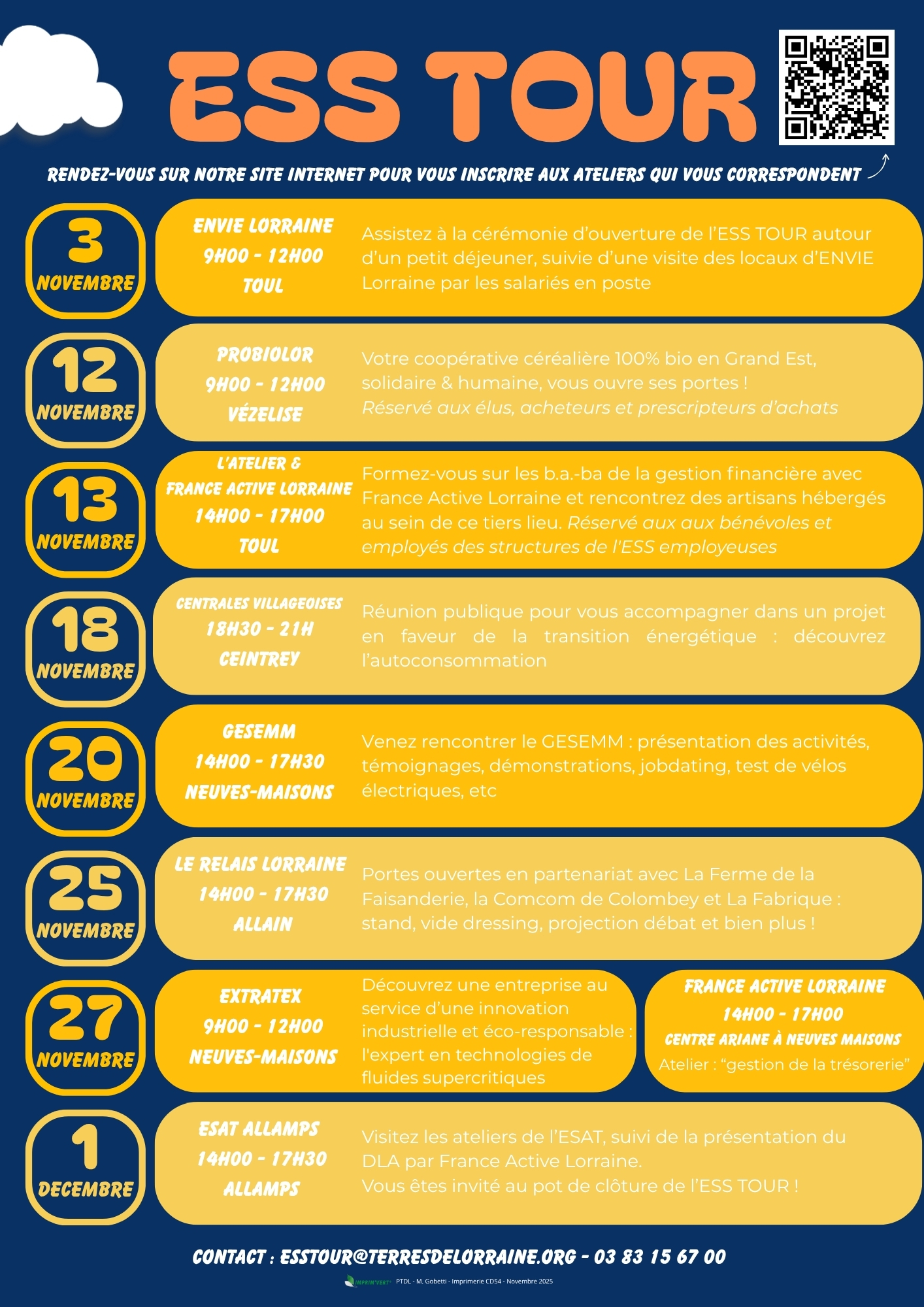 Le Pays Terres de Lorraine (PTDL) et ses partenaires (le Département de Meurthe et Moselle, France Active Lorraine, IAE Grand Est, Lorr'Up et la Maison de l'Emploi TDL) sont ravis de vous inviter, en novembre 2025, à « l'ESS TOUR Terres de Lorraine ».