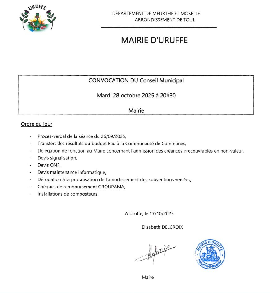 Le conseil Municipal se réunira en mairie ce mardi 28 octobre 2025 à 20:30. Vous pourrez trouver l'ordre du jour ci-dessus.