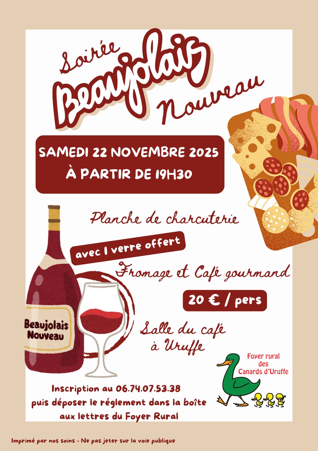 La soirée Beaujolais organisée par le foyer rural se tiendra le samedi 22 novembre 2025 à partir de 19h30 à la salle de l'ancien café.