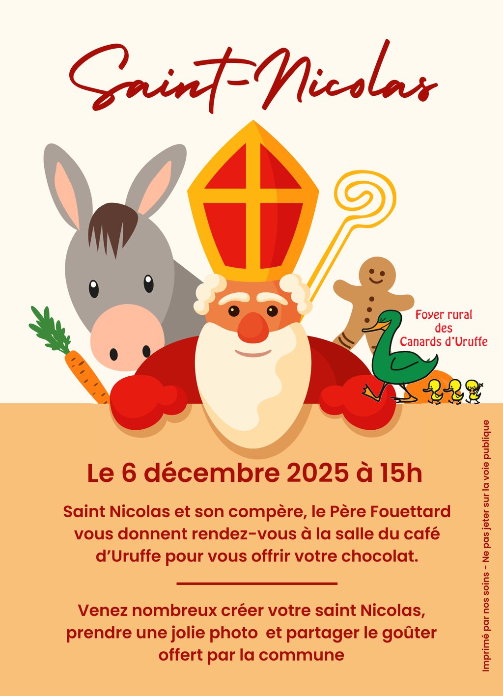 À l'occasion de la Saint-Nicolas qui se déroulera ce samedi 6 décembre 15h00 à la salle du café, Saint-Nicolas et son compère, le Père Fouettard, donnent rendez-vous aux enfants du village pour la distribution de chocolats.