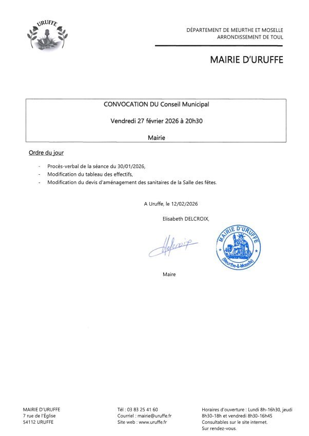 Le conseil Municipal se réunira en mairie le vendredi 27 février 2026 à 20h30. Vous pourrez trouver l'ordre du jour ci-dessus.