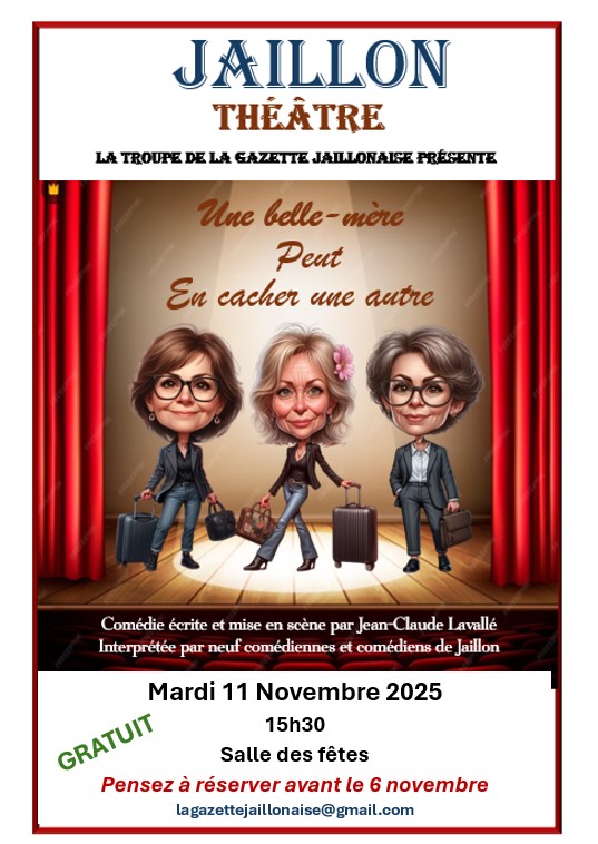 La troupe de la Gazette Jaillonaise vous donne rendez-vous le 11 novembre 2025 à 15 h 30 à la salle des fêtes de Jaillon pour vous faire découvrir leur nouveau spectacle " UNE BELLE MÈRE PEUT EN CACHER UNE AUTRE".